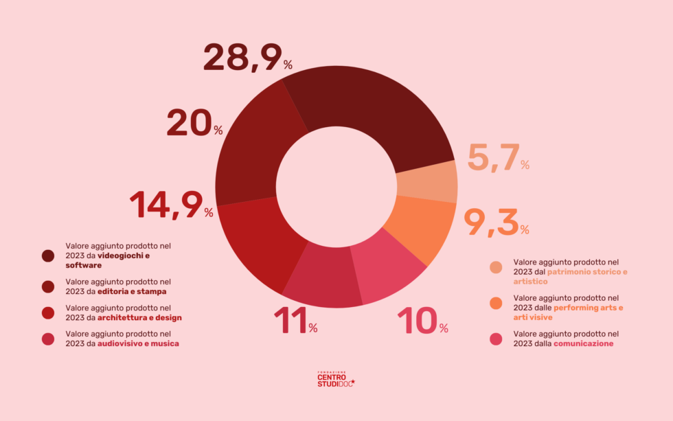 Tra i comparti più performanti emerge quello dei software e videogiochi, che si conferma il principale generatore di ricchezza con 16,7 miliardi di euro, seguito da editoria e stampa e dal settore architettura e design. Anche l’occupazione legata alla valorizzazione patrimonio storico e artistico ha presentato una crescita, segnale di una ripresa del comparto dopo gli anni della pandemia.